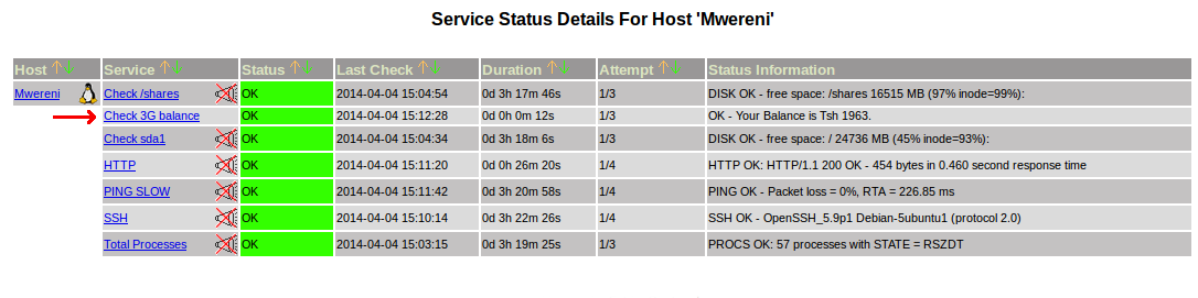 #!/usr/bin/perl my @devices = qw(/dev/ttyUSB1 /dev/ttyUSB0 /dev/ttyUSB2); my $continue = 1; my $balance = 0; for my $dev (@devices) { if ($continue) { system("/usr/bin/comgt -d $dev sig >/dev/null 2>&1"); if ($? == 0) { $balance=`/usr/local/bin/gsm-ussd -m $dev *102# | cut -d" " -f4`; $continue = 0; } } } if ($balance < 1000) { print "CRITICAL - Your balance is Tsh $balance."; exit 2; } else { print "OK - Your balance is Tsh $balance."; exit 0; }